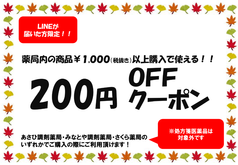 みなとや薬局公式LINE 11月のクーポンは 『200円値引クーポン』