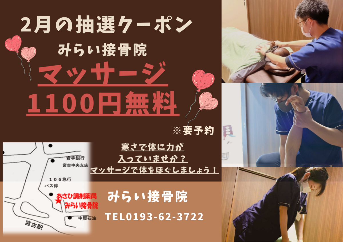 今月のみなとや薬局公式LINE抽選クーポンは「みらい接骨院マッサージ1,100円分無料」